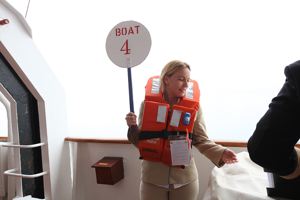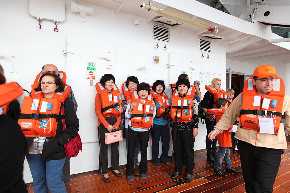 받았던 비상시 구명조끼를 입어보고 있습니다.